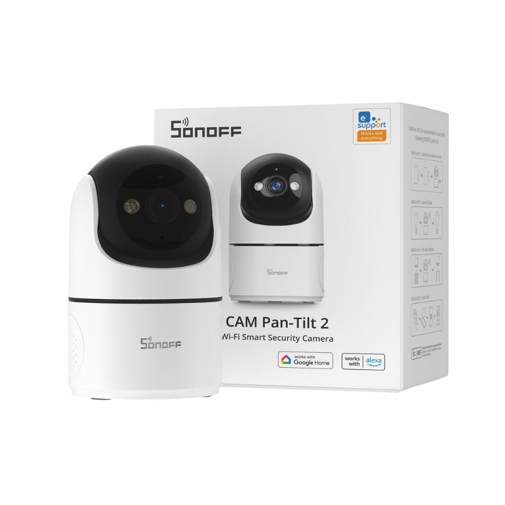 De Sonoff CAM Pan-Tilt 2 (CAM-PT2) is een geavanceerde beveiligingscamera voor binnen met een 1080p HD-resolutie en H.264-videocompressie, die zorgt voor gedetailleerde en duidelijke bewaking van uw woning. Het 360° panoramische beeld zorgt voor volledige dekking zonder dode hoeken, terwijl het verbeterde nachtzicht 24/7 bewaking garandeert. Uitgerust met ingebouwde tweeweg audio (microfoon en luidspreker), kunt u direct communiceren met familieleden. De camera ondersteunt vooraf ingestelde posities, zodat u zich met één tik kunt concentreren op belangrijke gebieden. Hij beschikt ook over een fysieke privacymodus, waarbij een klepje de lens automatisch afschermt om uw privacy te beschermen. Of u hem nu thuis of op kantoor gebruikt, de CAM-PT2 is een betrouwbare en veelzijdige beveiligingsoplossing voor binnen. Hij integreert eenvoudig in uw bestaande smarthomesysteem en bevat een reeks intelligente functies voor verbeterde beveiliging en gebruiksgemak. Dit Plug & Play-apparaat is eenvoudig te installeren, wordt gevoed via een USB-C-kabel en is eenvoudig te configureren via de officiële eWeLink-app.